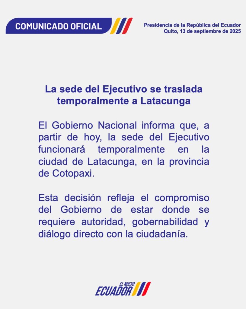 El Gobierno Nacional anunció oficialmente el traslado temporal de su sede administrativa a la ciudad de Latacunga, capital de la provincia de Cotopaxi. Esta decisión, que responde a motivos estratégicos y de seguridad, ha generado un amplio debate en el ámbito político y social del país.
